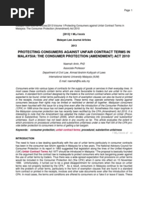 Pdf Protecting Consumers Against Unfair Contract Terms In Malaysia The Consumer Protection Amendment Act 2010