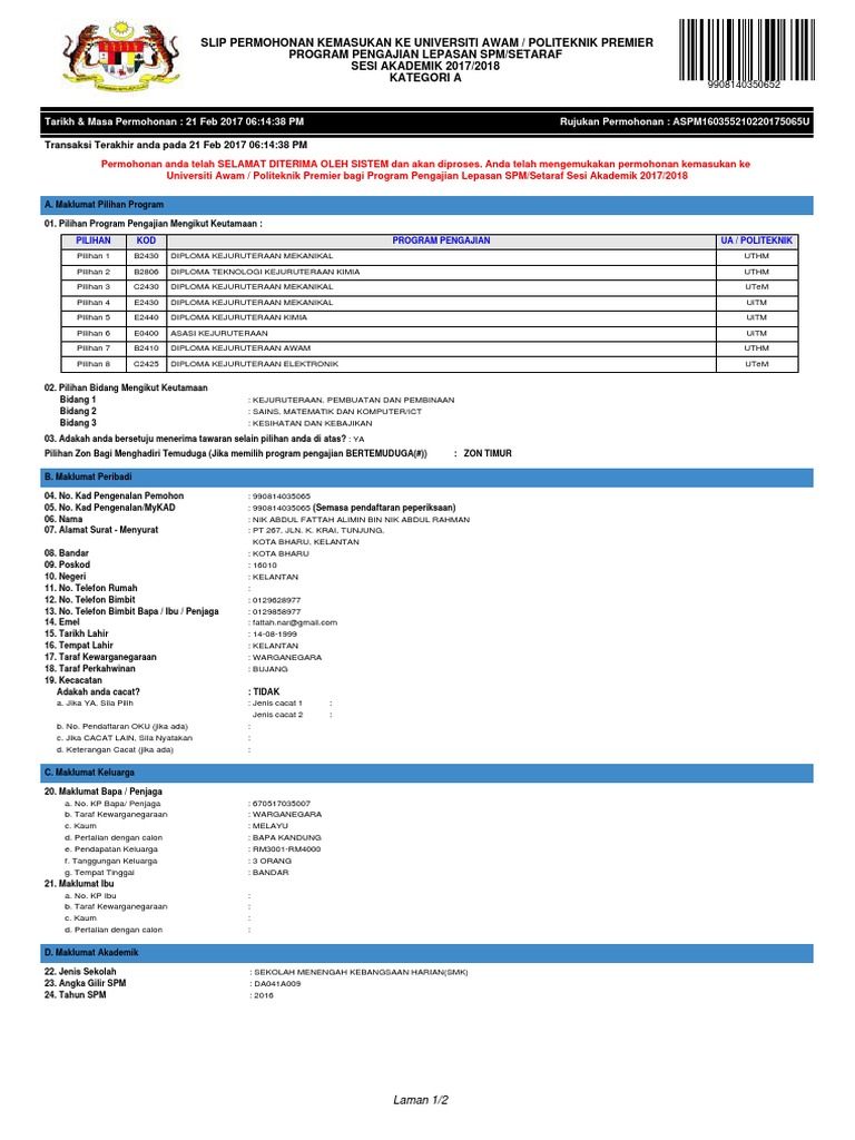 Slip Permohonan Kemasukan Ke Universiti Awam Politeknik Premier Program Pengajian Lepasan Spm Setaraf Sesi Akademik 2017 2018 Kategori A